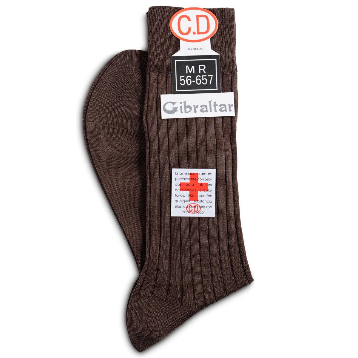 • Par de meias castanhas caneladas com etiquetas de marca e instruções