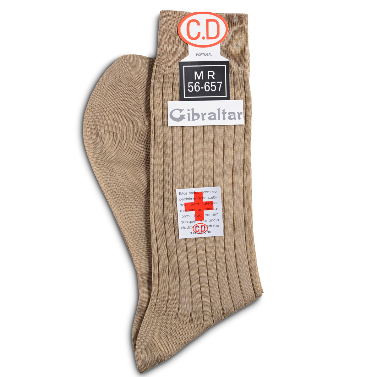 Par de meias bege caneladas com etiquetas e textos visíveis