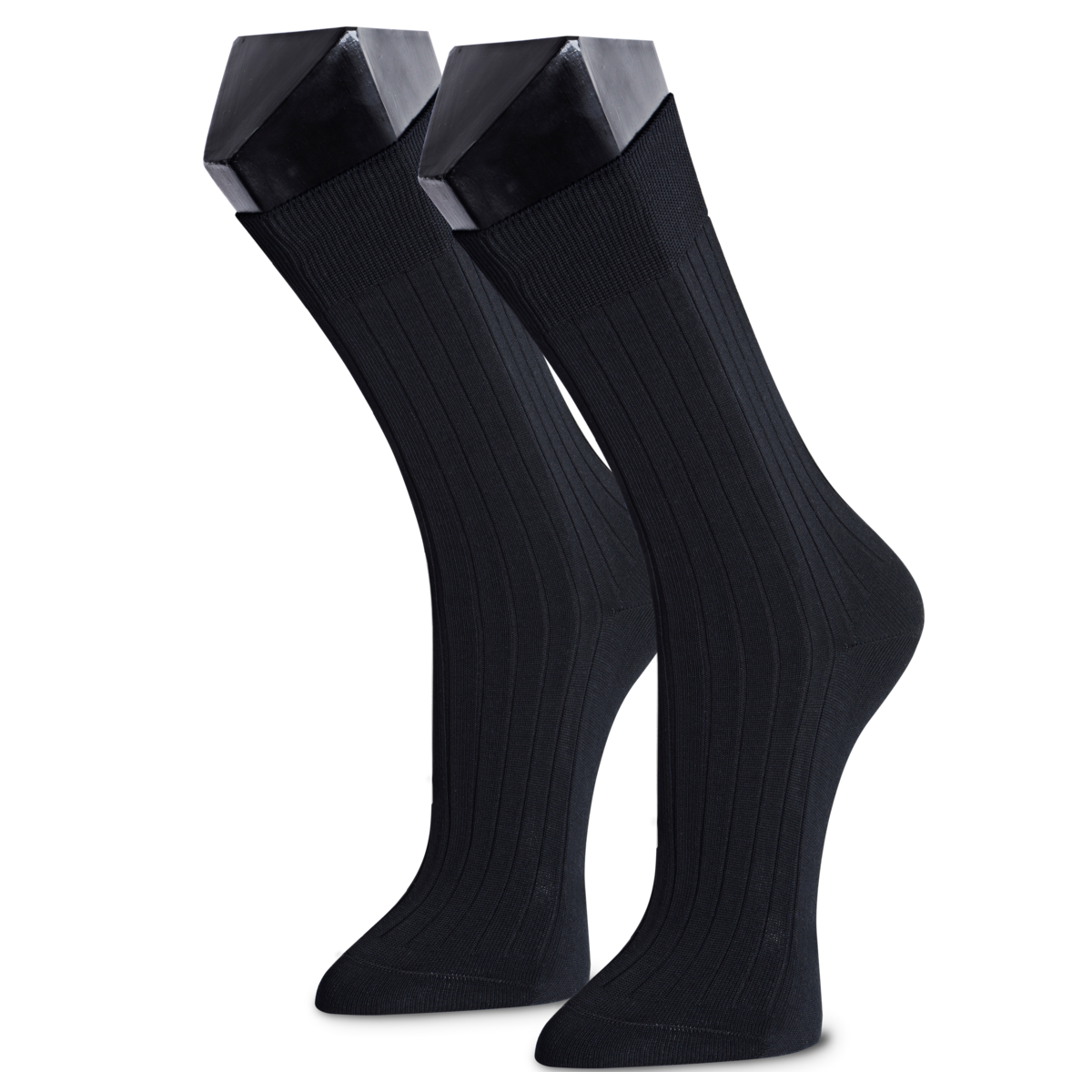 • Par de meias pretas com riscas verticais em suporte preto