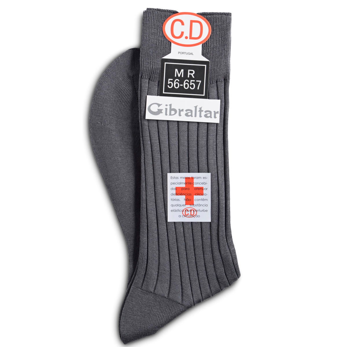 • Meias cinzentas com riscas verticais e etiquetas com texto em português