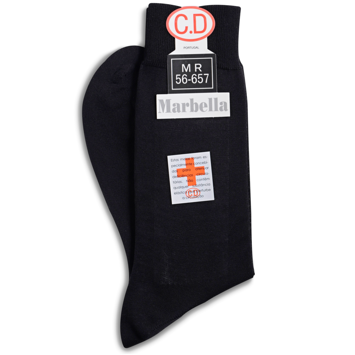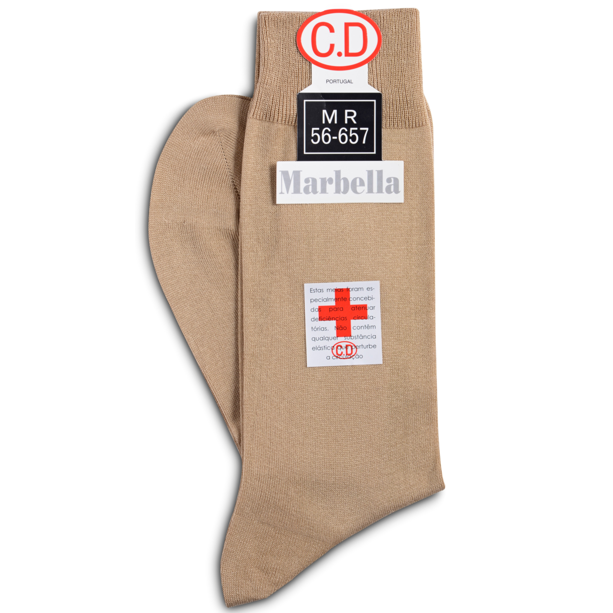• Meias castanhas com etiquetas C.D Portugal, MR 56-657, Marbella e selo informativo.