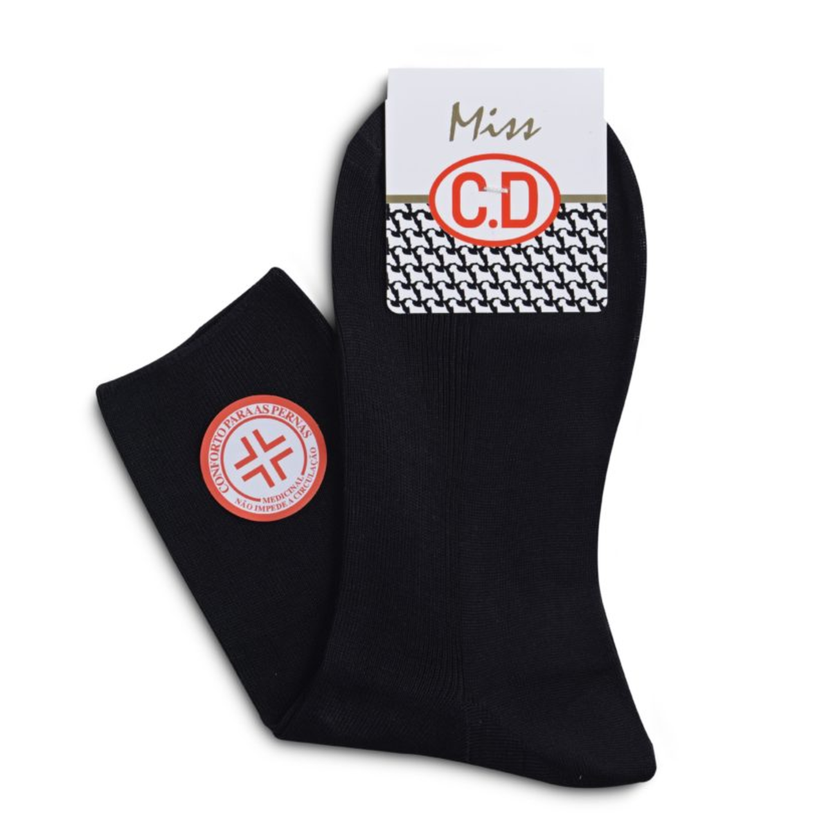 • Meias pretas com embalagem com texto Miss C.D e selo vermelho na meia